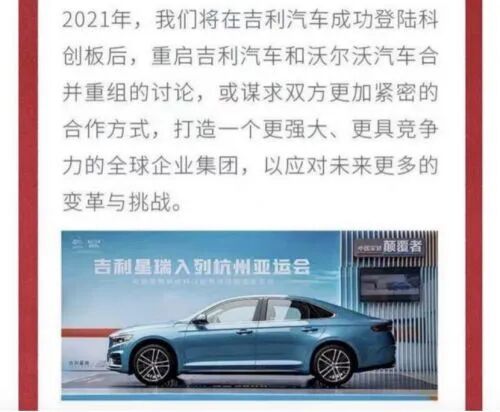 12月31日,吉利集团董事长李书福在2021年新年致辞中表示,吉利汽车登陆科创板后将重启与沃尔沃汽车合并重组的讨论,以谋求双方更加紧密的合作方式。