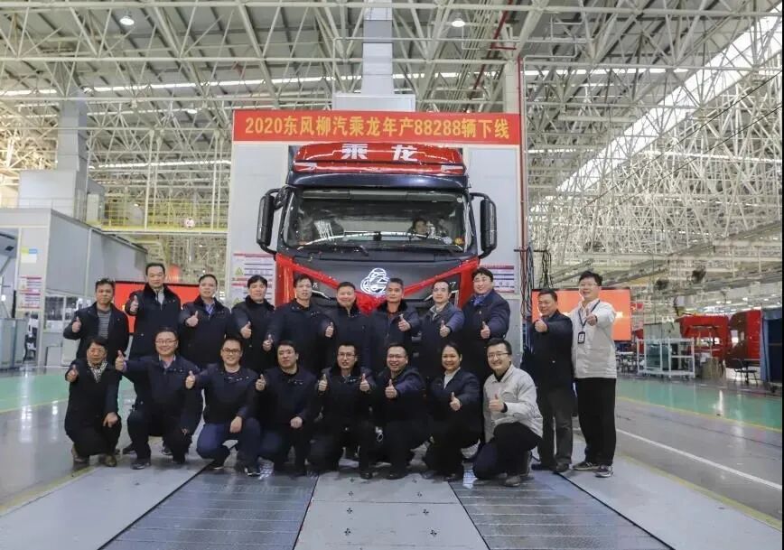 2020年12月30日,东风柳汽商用车年度第88288辆整车下线仪式暨2021年冲刺10万辆动员大会在商用车总装车间下线口举行。17时整,一辆戴着大红花的激情红国六款新乘龙H7缓缓开出下线口,宣告着东风柳汽商用车在2020年防疫保产战役中不负众望超额完成年度生产目标。全年创纪录的完成88288辆整车生产下线,同比增长46.9%,创造了商用车连续四年生产创新高的局面。