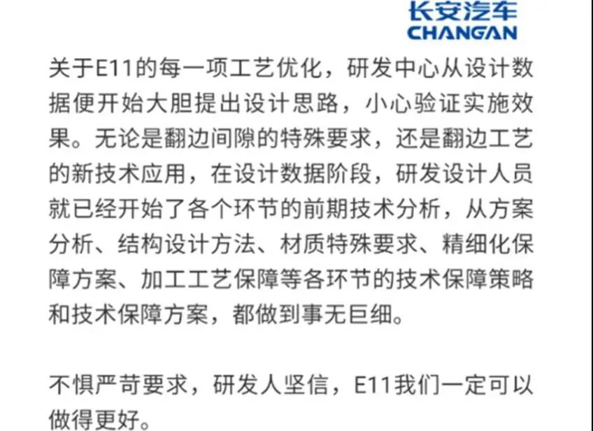 长安与华为和宁德时代打造的全新高端智能汽车品牌下首款车型将于2021年推出,新车很可能基于EMP2平台打造,定位一款中型纯电SUV,内部代号或为“E11”。长安最新研发的碳纤维-铝合金混合结构车身有望应用到“E11”车型身上,使得新车在安全和轻量化方面表现更加优秀。目前长安已对E11项目装配助力机械手设备进行供应商公开招募。