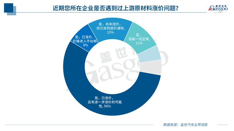 据盖世汽车近日发起的一份有近一千五百人参与的调查显示,近八成参与者表示其所在企业近期遭遇过原材料涨价,且超半数参与者认为未来还有进一步涨价的可能,却只有11%的参与者表示其所在公司近期尚未遇到原材料涨价情况。