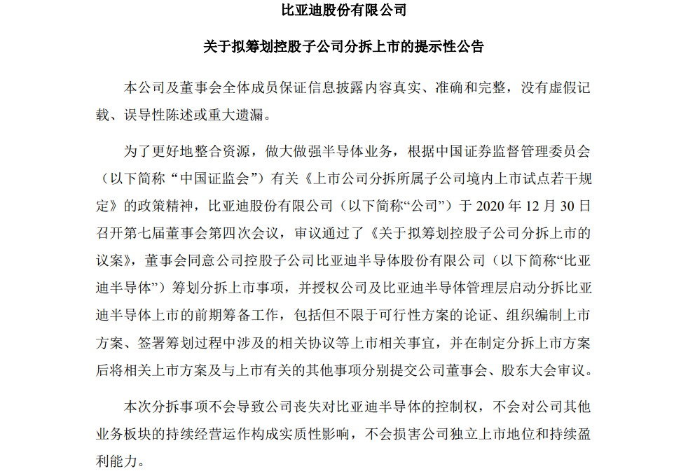 近日,比亚迪发布公告称,公司在当日召开第七届董事会第四次会议上审议通过了《关于拟筹划控股子公司分拆上市的议案》,董事会同意公司控股子公司比亚迪半导体股份有限公司筹划分拆上市事项,并授权公司及比亚迪半导体管理层启动分拆比亚迪半导体上市的前期筹备工作。