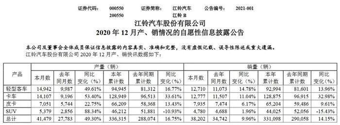 江铃汽车发布2020年12月产、销快讯数据,公司2020年12月销量为38,202辆,同比增长9.96%;2020年累计销量331,098辆,同比增长14.15%。其中,轻型客车与卡车的销量占比超过五成,SUV成为唯一下滑的板块。江铃汽车总裁王文涛表示,江铃汽车一直以商用车业务作为立身之本,在乘用车销售网络和能力方面还很欠缺。为了弥补这一短板,江铃汽车正在积极推进相应工作。