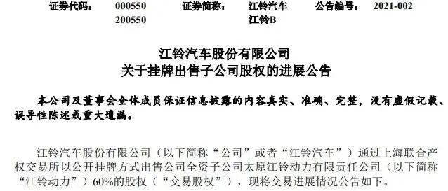 1月7日,江铃汽车发布关于挂牌出售子公司股权的进展公告,公司以公开挂牌方式出售公司全资子公司太原江铃动力有限责任公司60%的股权。至挂牌公告期满,上述标的征集到一名意向受让方即云南云内动力集团有限公司,摘牌价格为人民币3.6亿元。