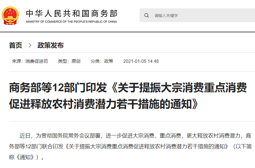 1月5日,为贯彻国务院常务会议部署,进一步促进大宗消费、重点消费,更大释放农村消费潜力,商务部等12部门联合印发《关于提振大宗消费重点消费促进释放农村消费潜力若干措施的通知》(以下简称《通知》)。《通知》提出五个方面工作任务,其中第一条为稳定和扩大汽车消费。