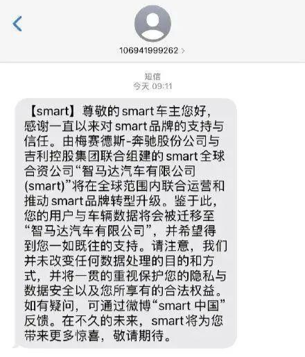 近日,有网友晒出了一条来自“smart官方”的短信截图。根据图片内容,由梅赛德斯-奔驰股份公司与吉利控股集团联合组建的smart全球合资公司——智马达汽车有限公司(smart),将在全球范围内联合运营和推动smart品牌转型升级。对此,汽车行业知名分析师钟师在接受《中国新闻周刊》采访时表示,吉利的适时入股除了可以让其与戴姆勒的股东关系更加融洽之外,更能让其以更低的成本拓展海外小型精品电动汽车市场,为其走向欧洲铺路。