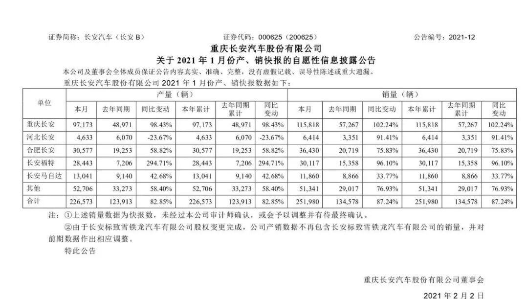 2月1日,长安汽车发布2021年1月销量快报,长安汽车集团销量251980辆,同比增长87.3%。