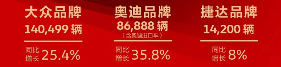 2021年1月,一汽-大众三大品牌累计终端销售241,587辆(含进口车),同比增长27.7%。其中,大众品牌销售140,499辆,同比增长25.4%;奥迪品牌销售86,888辆(含进口车),同比大增35.8%,创下历史最高纪录;捷达品牌销售14,200辆,同比增长8%。一汽-大众持续助力汽车行业回暖,提振行业发展信心。