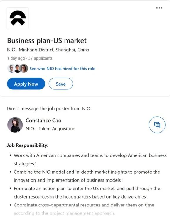 近日,领英(LinkedIn)上出现了一则蔚来汽车发布的招聘信息,蔚来新设置了一个空缺的中高级管理人员岗位,希望应聘者能够带队拓展美国的市场业务,不少业内人士及分析师认为,这意味着蔚来可能要进军美国市场。蔚来试图剑指海外市场的消息也并不是空穴来风,早在去年7月,蔚来CEO李斌在一次采访中透露,他们正在努力进入包括美国、欧洲在内的多个国际市场。而去年年底,则有消息称蔚来将在欧洲市场销售新车,第一家NIO House将建立在丹麦哥本哈根。当时也有消息人士称,蔚来目前已经组建海外业务团队,计划两年时间在当地销售7000辆新车。