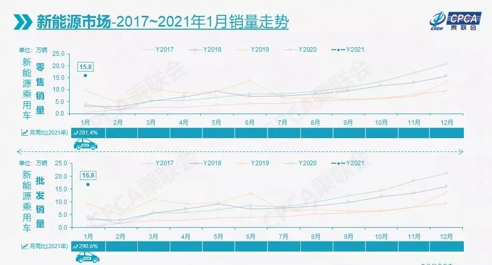 2月8日,乘联会发布的2021年1月销量数据显示,1月新能源乘用车市场零售量为15.8万辆,环比下降23.9%,同比增长281.4%。从同比大幅增长的情况来看,今年新能源乘用车市场呈现高开走势。而市场呈现高开走势与多款车型热销的强势拉动不无关系,在1月新能源汽车销量榜单中,宏光MINIEV销量超过2.5万辆、国产特斯拉Model 3销量约1.4万辆、比亚迪汉EV销量为9298辆,从市场表现来看,到了2021年,这几款车型热销的行情还在延续。