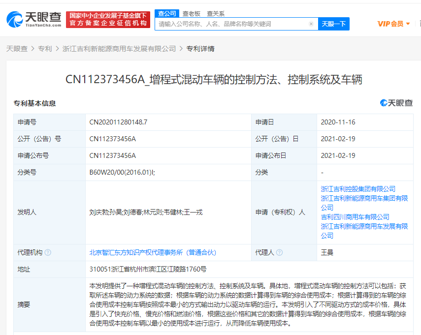 天眼查App显示,2月19日,浙江吉利控股集团有限公司公开了一项名为“增程式混动车辆的控制方法、控制系统及车辆”的专利,专利申请时间为2020年11月16日。专利摘要显示,本发明引入不同驱动方式的成本价格,具体是引入了快充价格、慢充价格和燃油价格,根据这些价格和其它的数据计算得到车辆的综合使用成本,根据车辆的综合使用成本控制车辆以最小的使用成本进行运行,从而降低车辆使用成本。