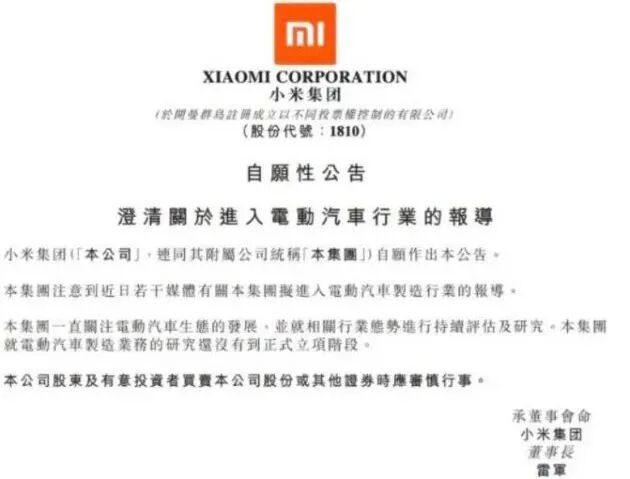 I 小米集团:电动汽车制造业务的研究还没有到正式立项阶段