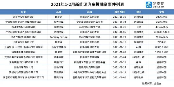 近日,企查查发布了一份关于“新造车”的全新统计报告。具体来看,截止到2021年2月23日,我国新能源汽车领域已发生13起投融资事件,包括比亚迪、恒大汽车、零跑汽车、合创汽车、法拉第未来等品牌。