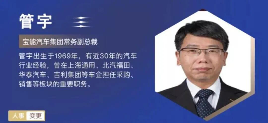 2月23日,从宝能汽车集团官方获悉,原吉利控股集团副总裁、经营管理委员会成员、采购公司总经理管宇已加盟宝能汽车,担任集团常务副总裁,与宝能汽车集团常务副总裁大谷俊明共同负责全面经营管理工作。
