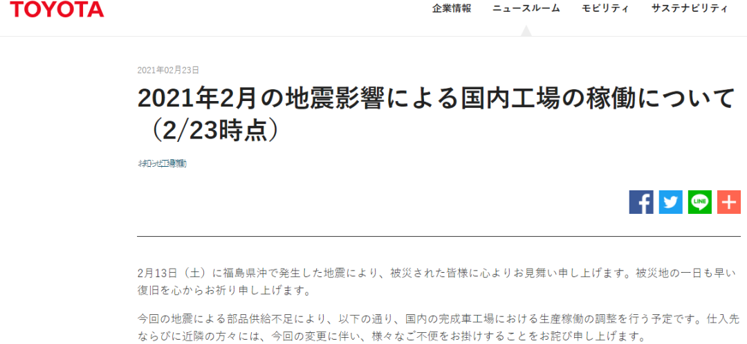 丰田汽车再遭停产。2月23日,丰田汽车官网发文称,由于地震影响导致零部件供应不足,宣布位于日本本土四家工厂共计5条生产线停止生产。