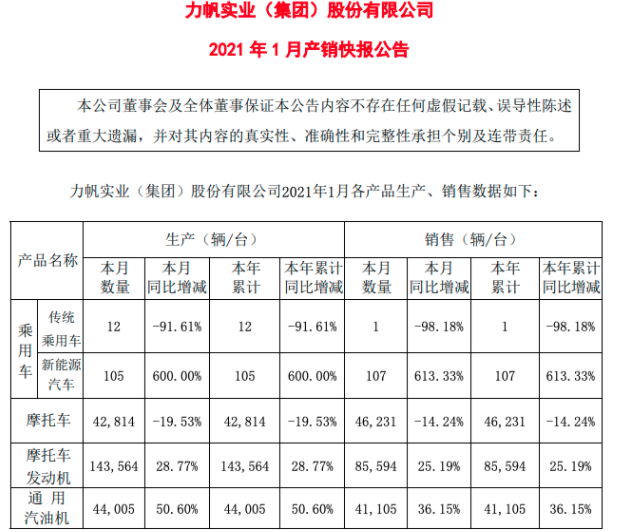 近日,力帆实业(集团)股份有限公司发布1月产销快报。1月份,力帆新能源乘用车实现产量105辆,同比增长600%;实现销量107辆,同比增长613.33%;与新能源汽车形成鲜明对比的,是力帆汽车的传统燃油乘用车的产销量。1月份力帆传统燃油乘用车产量为12辆 ,同比下滑91.61%;1月的销量更为惨淡,仅销售1辆,同比下滑98.18%。