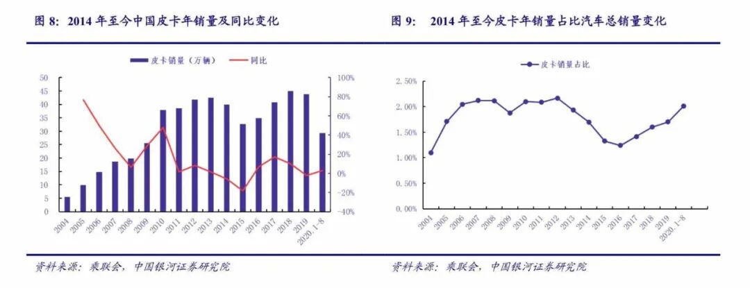 据乘联会数据,2020年皮卡总量增长了约9%。其中12月份,皮卡市场销量达4.9万辆,同比增长8%。在中国,皮卡销量仅占汽车总销量的不到2%。在业内人士看来,如果对标海外成熟汽车市场,未来,皮卡在中国有巨大增长潜力。如今越来越多的城市解禁皮卡,预计这部分车型将会迎来更大的市场需求。2020年中国皮卡销量已接近48万辆,超越加拿大,成为全球第二大皮卡市场(销量仅次于美国)。