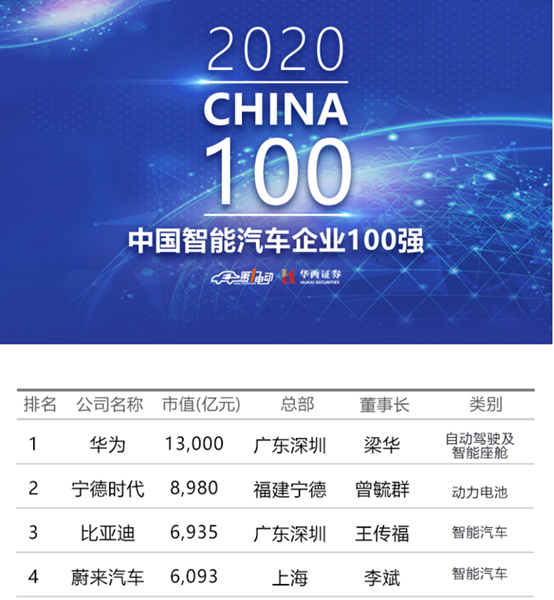 2月1日第一电动网与华西证券发布2020中国智能汽车百强榜,根据公司估值,华为、宁德、比亚迪及蔚来汽车拿下了前四名。